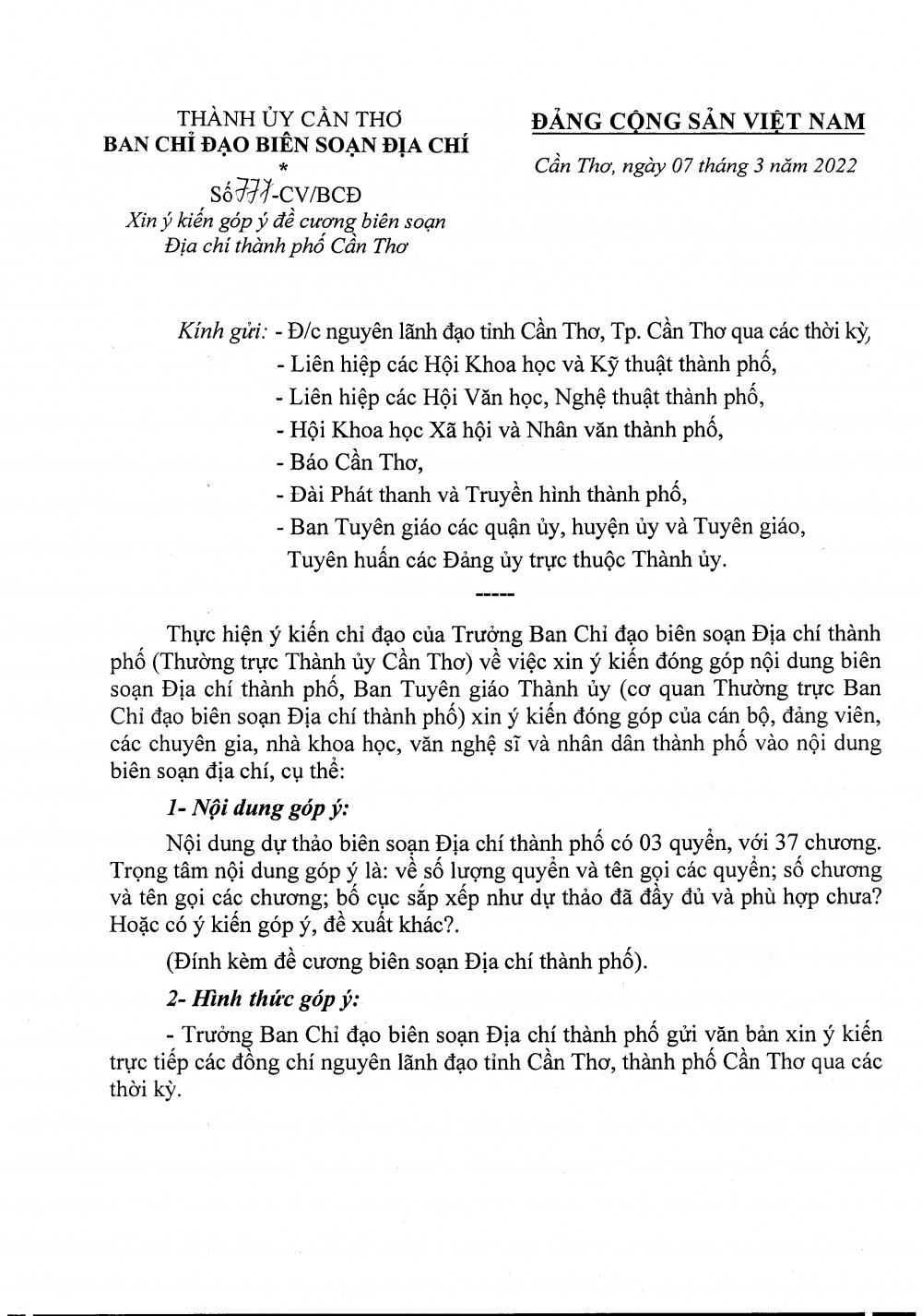 Thực hiện ý kiến chỉ đạo của Trưởng Ban Chỉ đạo biên soạn Địa chí TP Cần Thơ (Thường trực Thành ủy Cần Thơ) về việc xin ý kiến đóng góp nội dung biên soạn Địa chí TP Cần Thơ, Ban Tuyên giáo Thành ủy, Cơ quan Thường trực Ban Chỉ đạo biên soạn Địa chí TP Cần Thơ, xin ý kiến đóng góp của cán bộ, đảng viên, các chuyên gia, nhà khoa học, văn nghệ sĩ và nhân dân thành phố vào nội dung biên soạn địa chí.