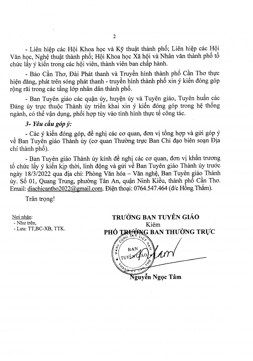 Các ý kiến đóng góp sẽ được các cơ quan, đơn vị tổng hợp và gửi góp ý về Ban Tuyên giáo Thành ủy Cần Thơ, Cơ quan Thường trực Ban Chỉ đạo biên soạn Địa chí TP Cần Thơ, qua địa chỉ: Phòng Văn hóa - Văn nghệ, Ban Tuyên giáo Thành ủy Cần Thơ, số 01, đường Quang Trung, phường Tân An, quận Ninh Kiều. Email: diachicantho2022@gmail.com. Điện thoại: 0764. 547.464 (gặp đồng chí Hồng Thắm).