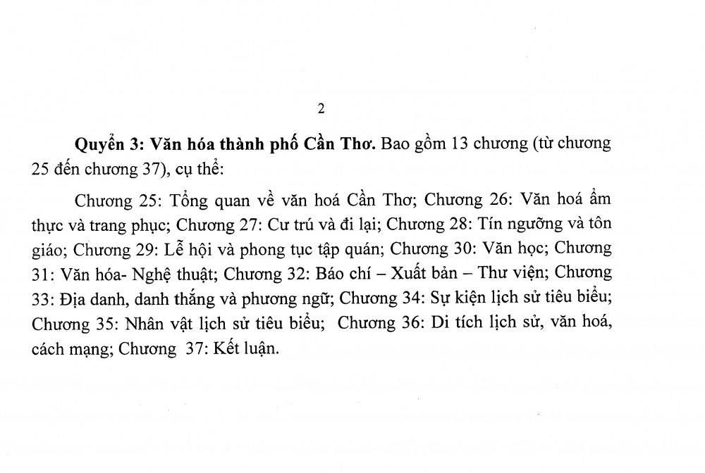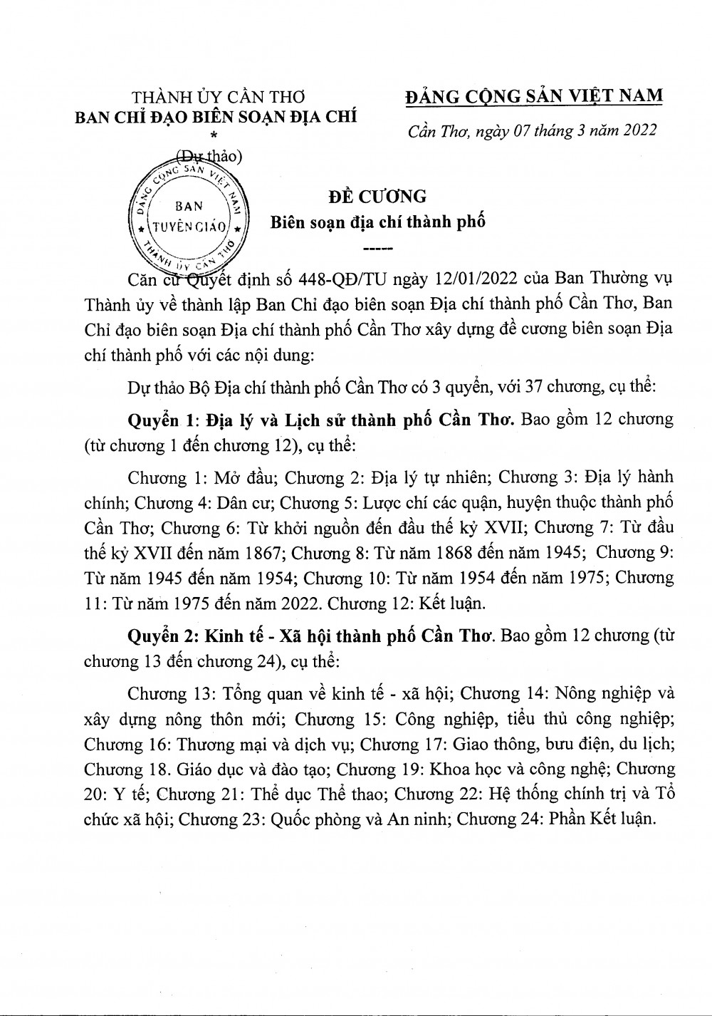 Theo dự thảo đề cương Địa chí TP Cần Thơ, công trình được biên soạn thành 3 quyển, với 37 chương.