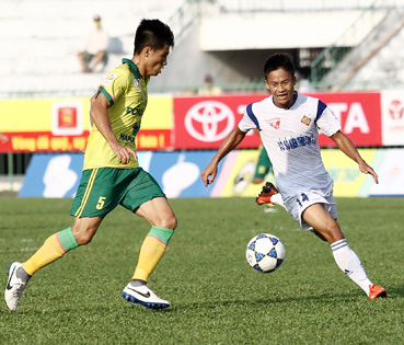 Dù chơi rất nỗ lực, nhưng tiền đạo Công Thảo (phải) chưa để lại dấu ấn sau 2 trận đấu của XSKT Cần Thơ. |