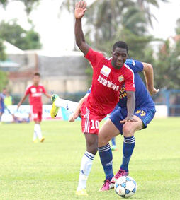 Souleymane nỗ lực vượt qua sự kèm cặp của cầu thủ Khánh Hòa. Ảnh: Phạm Trung |