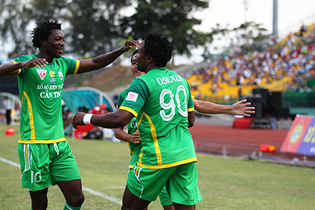 Các cầu thủ Cần Thơ chia vui cùng Oseni.