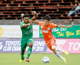 Oseni (trái) vẫn “nhả đạn” vào lưới Sài Gòn dù thiếu người đá cặp Patiyo. |