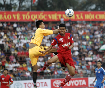 Lê Văn Thắng bay người đánh đầu, uy hiếp khung thành thủ môn của QNK Quảng Nam. |