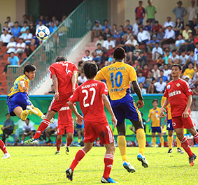 Thể hình nhỏ nhưng Đăng Khoa (trái) của Đồng Tháp vẫn có cú đánh đầu nguy hiểm trước sự chống đỡ yếu ớt của hàng thủ Cần Thơ. Ảnh: Minh Thảo |