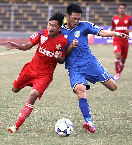Các cầu thủ Cần Thơ (trái) vất vả với cầu thủ Quảng Nam ở lượt đi trên sân nhà. Ảnh: NGUYỄN MINH