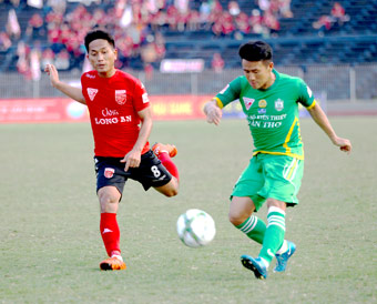Tiền vệ Quang Tình (phải) của XSKT Cần Thơ trong trận thắng Long An 2-1, là “cầu nối” ở tuyến giữa của đội bóng Tây Đô. |