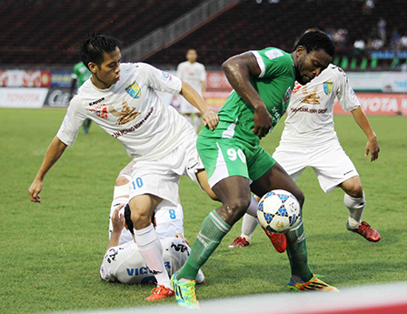 Hàng thủ XSKT Cần Thơ (áo xanh) vất vả chống đỡ Gonzalo.
