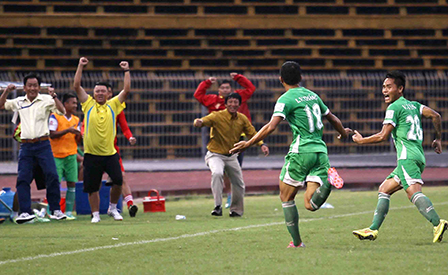 Văn Thắng (18) mừng bàn thắng mở tỷ số cùng Ban huấn luyện XSKT Cần Thơ.