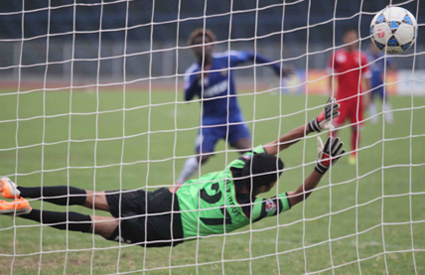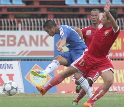 Cú sút nâng tỷ số lên 4-1 của Xuân Thắng (áo xanh) |