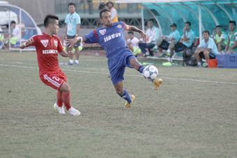 Tiền đạo Luiz (phải) của XSKT Cần Thơ tranh bóng với Âu Văn Hoàn (Becamex Bình Dương) trong trận thua 1-3 của XSKT Cần Thơ. |