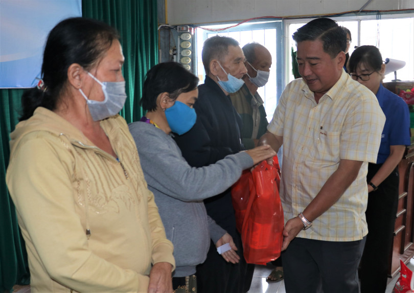 Đồng chí Huỳnh Mười Một, Bí thư Huyện ủy Cờ Đỏ trao quà Tết các gia đình chính sách, hộ có hoàn cảnh khó khăn trên địa bàn xã Trung Hưng.