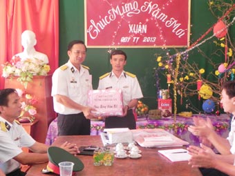 Đại tá Nguyễn Duy Tỷ, Phó Tư lệnh Vùng 5 Hải quân, thăm hỏi và trao quà Tết cho cán bộ, chiến sĩ Trạm radar 600 đảo Nam Du. Năm nay, Bộ Tư lệnh Vùng 5 Hải quân đã chuyển trao 70 tấn hàng hóa phục vụ Tết cho cán bộ, chiến sĩ các đơn vị. Ảnh: PHẠM TRUNG. |