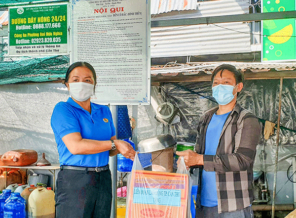 ► Ngày 20-8-2021, bà Huỳnh Thị Hiền, Phó Chủ tịch Thường trực LÐLÐ TP Cần Thơ đã đến thăm hỏi, tặng quà các công đoàn viên gặp khó khăn trên địa bàn quận Bình Thủy. LÐLÐ TP Cần Thơ tặng 100 phần quà cho các công đoàn viên thuộc các nghiệp đoàn bánh dân gian, du lịch, xe mô tô khách và nhóm giữ trẻ tư thục trên địa bàn quận. Mỗi phần quà trị giá 150.000 đồng, từ nguồn vận động xã