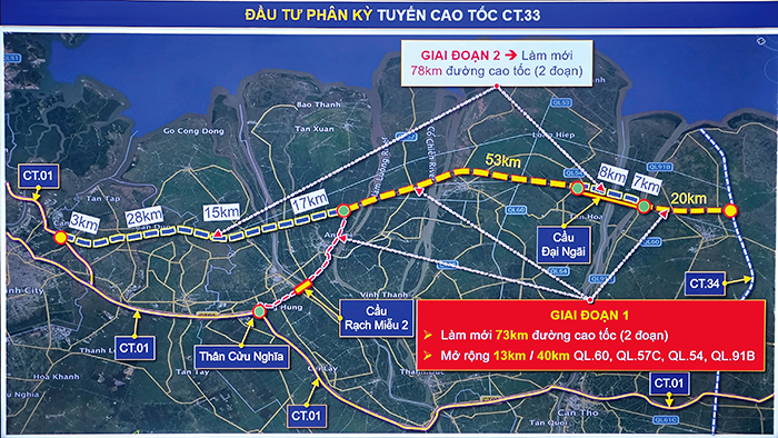 Ông Lê Quỳnh Mai, Phó Chủ tịch Hội đồng quản trị Tập đoàn Đèo Cả, cho biết: Hướng tuyến cao tốc CT.33 đi qua 5 tỉnh, thành phố; trong phạm vi này Tập đoàn Đèo Cả nghiên cứu các tuyến đường có tính chất song song như tuyến cao tốc CT.01 (TP Hồ Chí Minh - Trung Lương - Mỹ Thuận - Cần Thơ - Cà Mau) và tuyến quốc lộ 1, tuyến trục ngang quốc lộ 91, 91B, 60… Trên cơ sở nghiên cứu này, xác định hành lang tuyến cao tốc CT.33, trong đó, có nghiên cứu phương án điều chỉnh hướng tuyến sao cho tiếp cận được hạ tầng trên quốc lộ 60, để dùng được các cầu lớn như Đại Ngãi, Hàm Luông, Cổ Chiên, Rạch Miễu 2… Tập đoàn khuyến nghị cần thiết đầu tư tuyến cao tốc CT.33 trước năm 2030 để đáp ứng yêu cầu phát triển vùng ĐBSCL.