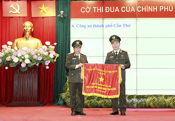 Thiếu tướng Nguyễn Văn Thuận, Ủy viên Ban Thường vụ Thành ủy, Bí thư Đảng ủy, Giám đốc Công an TP Cần Thơ (bên trái) nhận Cờ “Đơn vị xuất sắc trong phong trào thi đua năm 2021” của Chính phủ tặng Công an TP Cần Thơ.
