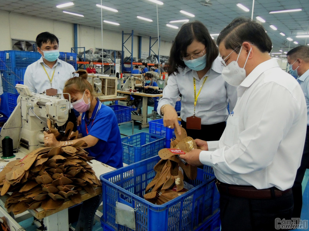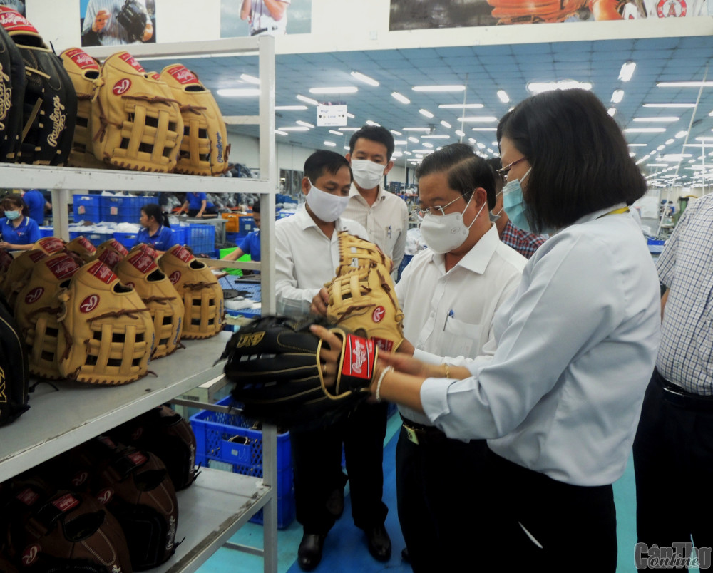 Đồng chí Trần Việt Trường, Phó Bí thư Thành ủy, Chủ tịch UBND TP Cần Thơ (bìa phải), thăm hỏi tình hình hoạt động của Công ty TNHH Quốc tế Tri - Viet. Ảnh: MỸ THANH