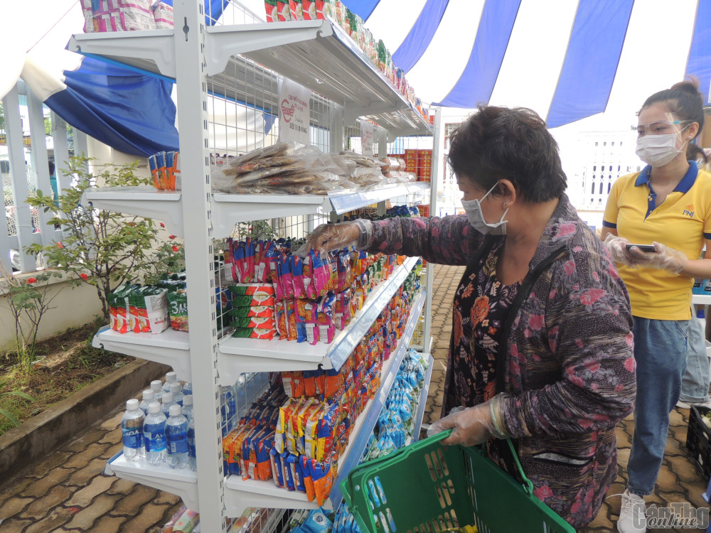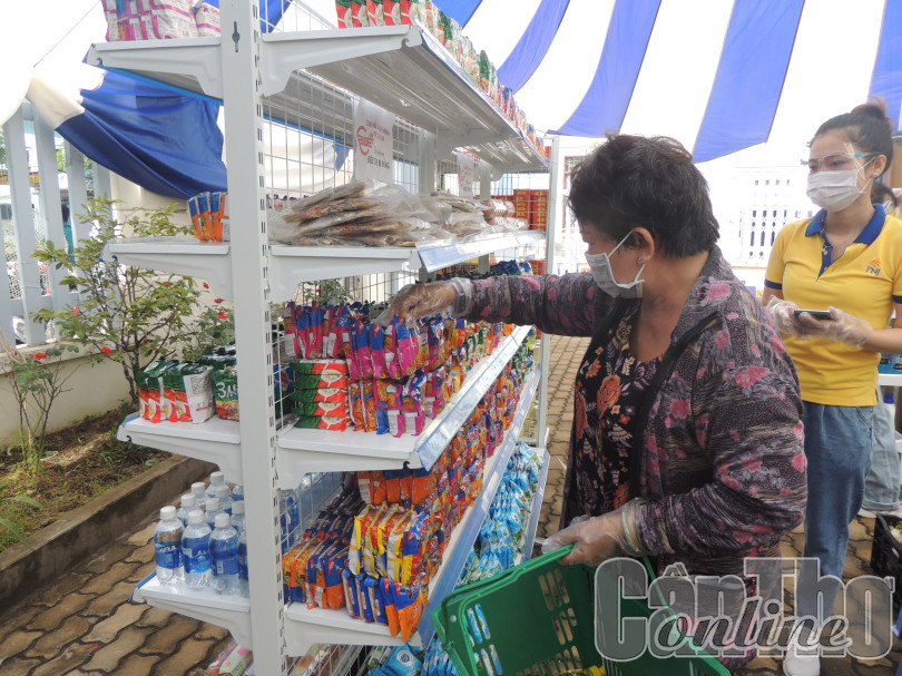 Siêu thị mini 0 đồng trên địa bàn phường Xuân Khánh, quận Ninh Kiều do nhiều doanh nghiệp, hộ kinh doanh cùng chung tay đóng góp trong đợt dịch COVID-19 vừa qua. Ảnh: MỸ THANH