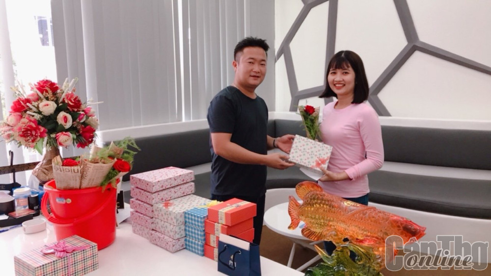 Lãnh đạo công ty CP Thực phẩm Phạm Nghĩa tặng hoa và quà cho nhân viên nữ nhân dịp 20-10. Ảnh: MỸ THANH