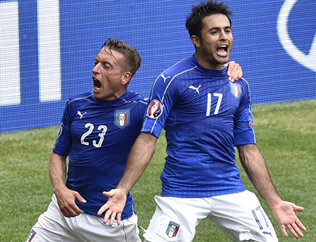 Eder (17) đã tỏa sáng với bàn thắng đẹp mắt vào cuối trận, đưa tuyển Ý tiến thẳng vào vòng 16 đội. ảnh: AFP/Getty