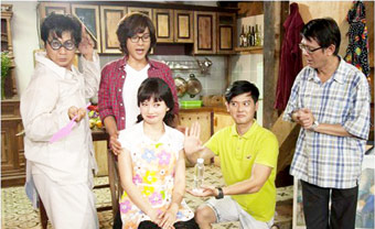 Kim Anh (Lan Phương, thứ hai, hàng trước, trái sang) phải đau đầu với 4 người đàn ông trong gia đình chồng. |