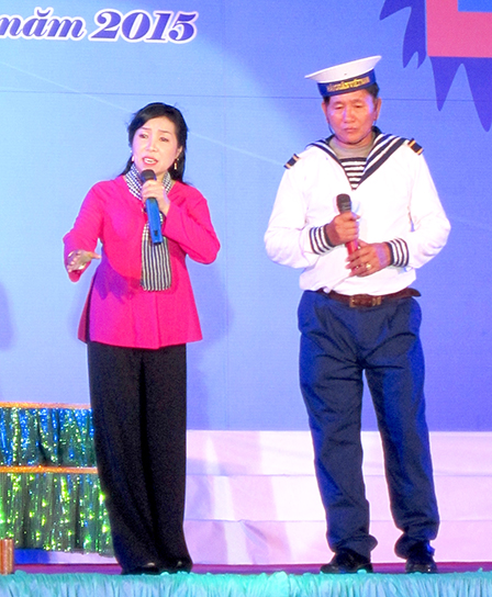 Chị Bùi Thị Xinh diễn ngâm bài "Phía sau người lính cảnh sát biển" với anh Lê Trường Sinh trong đêm thơ Nguyên tiêu 2015.
